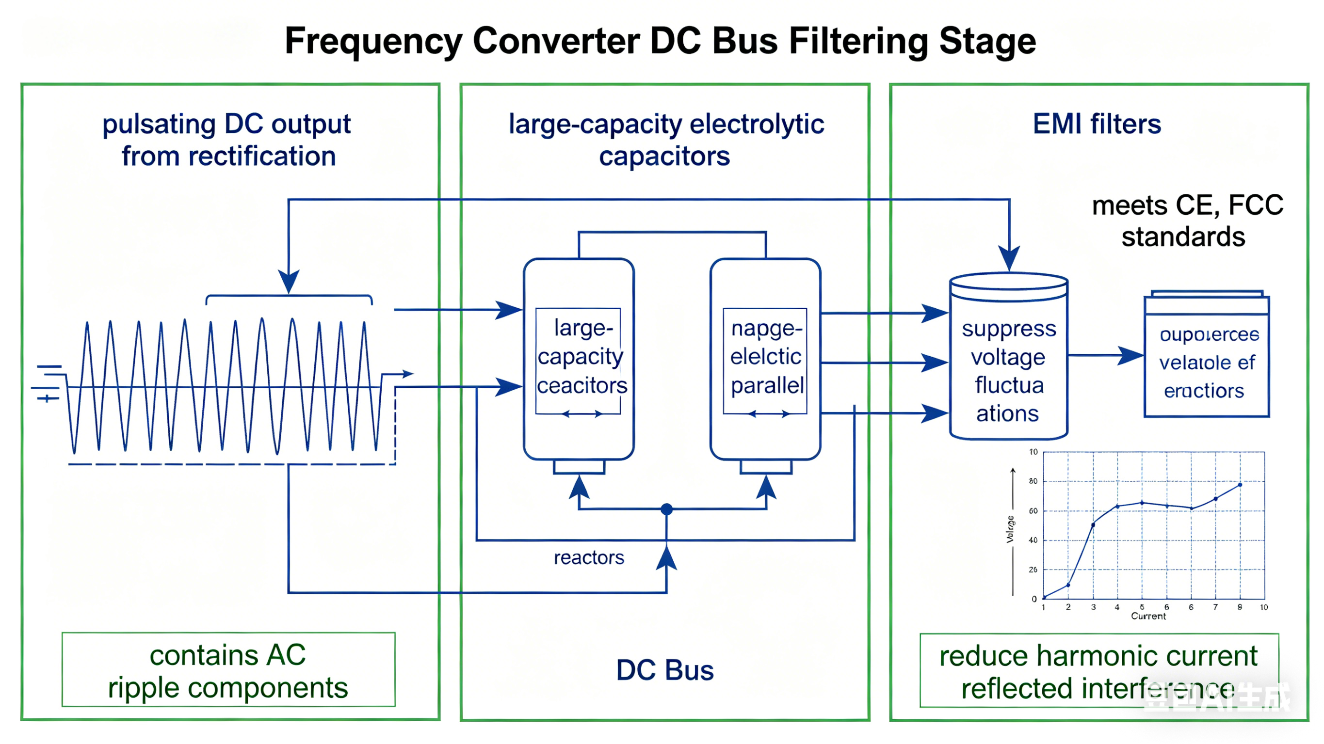 ال pulsating DC output from the rectifier contains AC ripple components; therefore, it must undergo smoothing and filtering via high-capacitance electrolytic capacitors and inductors situated on the DC bus. The energy-storage characteristics of the capacitors effectively suppress voltage fluctuations, while the inductors serve to mitigate harmonic current interference reflected back into the power grid. High-quality frequency converters typically feature built-in EMI filters to ensure compliance with international electromagnetic compatibility standards, such as CE and FCC.