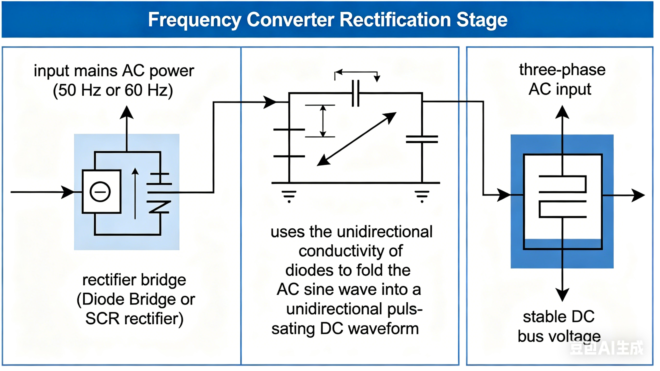 تستخدم محولات التردد الثابتة الحديثة عادةً طوبولوجيا التحويل المزدوج "AC-DC-AC". يمكن تقسيم العملية التشغيلية الأساسية إلى المراحل الثلاث التالية: