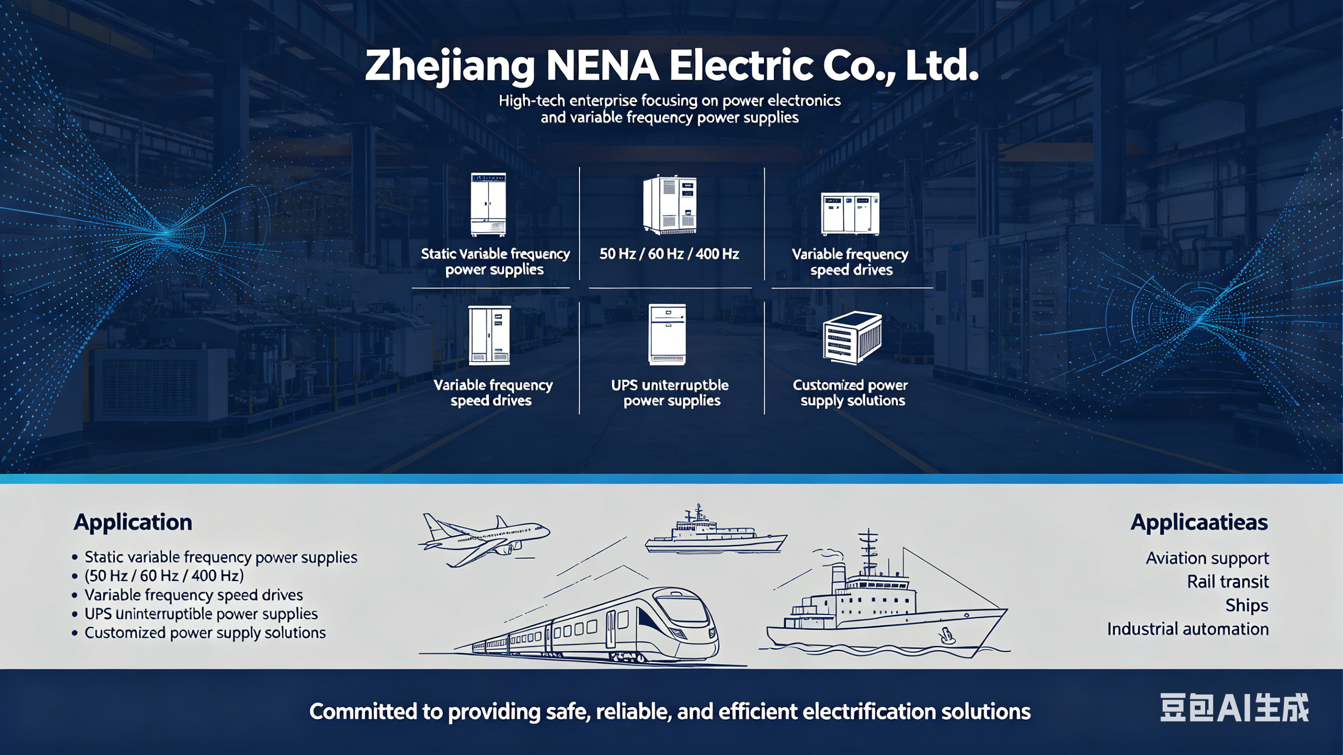 ال company's product portfolio encompasses static frequency converters (50 Hz / 60 Hz / 400 Hz), variable-speed drives, UPS uninterruptible power supplies, and customized power solutions. These products are widely deployed in demanding sectors such as aviation support, rail transit, marine engineering, and industrial automation. Supported by a comprehensive R&D framework and a rigorous quality control system, NENA Electric is committed to delivering safe, reliable, and efficient electrification solutions to customers worldwide.