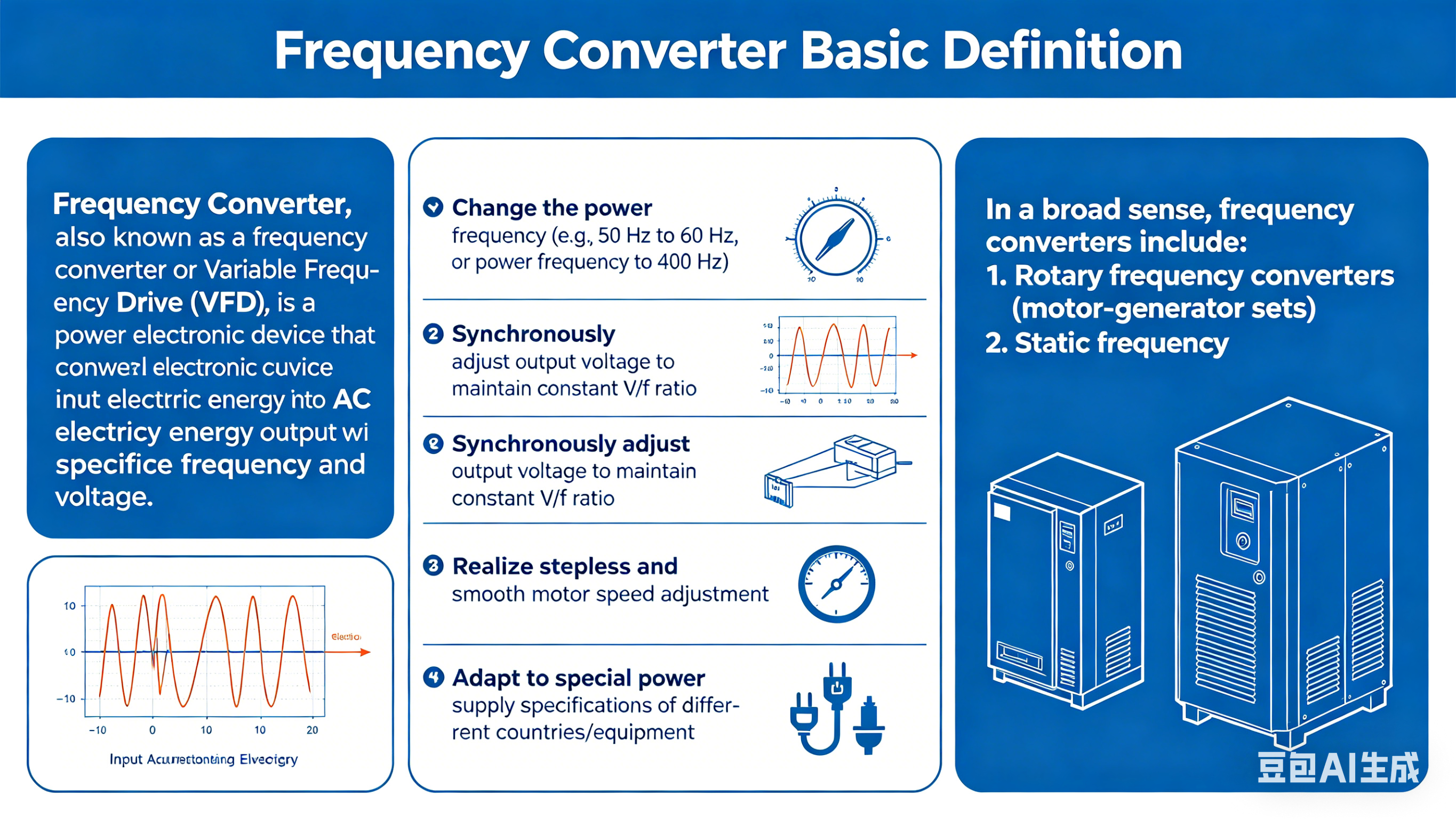 ◆ التكيف مع متطلبات إمدادات الطاقة المحددة لمختلف البلدان أو المعدات المتخصصة. بشكل عام، يشمل مصطلح "محول التردد" جميع الأجهزة القادرة على تحقيق تحويل التردد، بما في ذلك محولات التردد الدوارة (في شكل مجموعات مولدات المحرك) ومحولات التردد الثابتة (المعتمدة على الأجهزة الإلكترونية للطاقة ذات الحالة الصلبة).