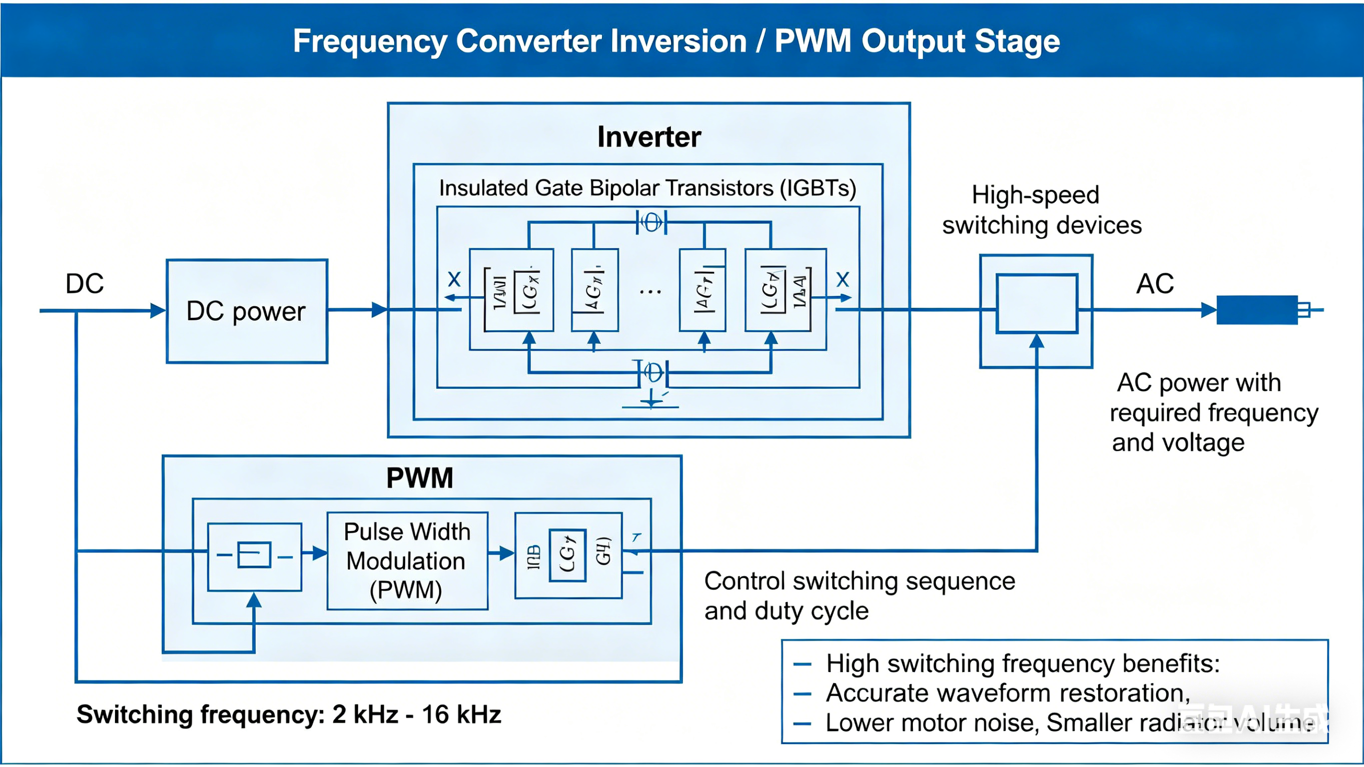 يتم إعادة تحويل طاقة التيار المستمر بواسطة عاكس إلى طاقة تيار متردد بالتردد والجهد المطلوبين. تستخدم محركات التردد المتغير الحديثة (VFDs) عادةً ترانزستورات البوابة المعزولة ثنائية القطب (IGBTs) كأجهزة تبديل عالية السرعة. من خلال استخدام تقنية تعديل عرض النبض (PWM) - على وجه التحديد من خلال التحكم في توقيت التبديل ودورة العمل لـ IGBTs - يقومون بدقة بتجميع شكل الموجة الجيبية المطلوبة.